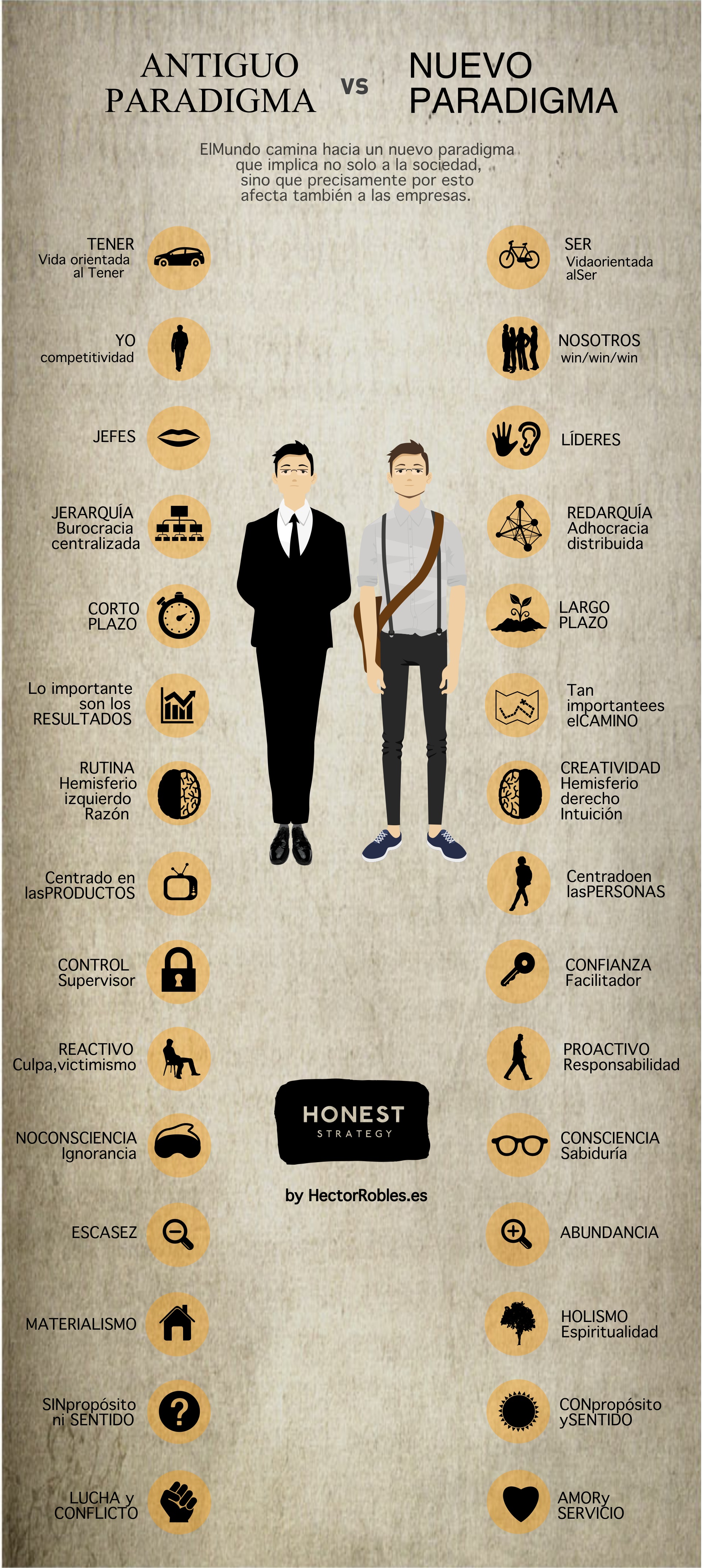 El Nuevo Paradigma habla de “liderar” en lugar de “jefear”, de “nosotros” frente al “yo”, del “largo plazo” frente al “corto plazo”, de la “riqueza” frente al “dinero”, de la “consciencia” frente a la “ignorancia”, de la “creatividad” frente a la “rutina”,…